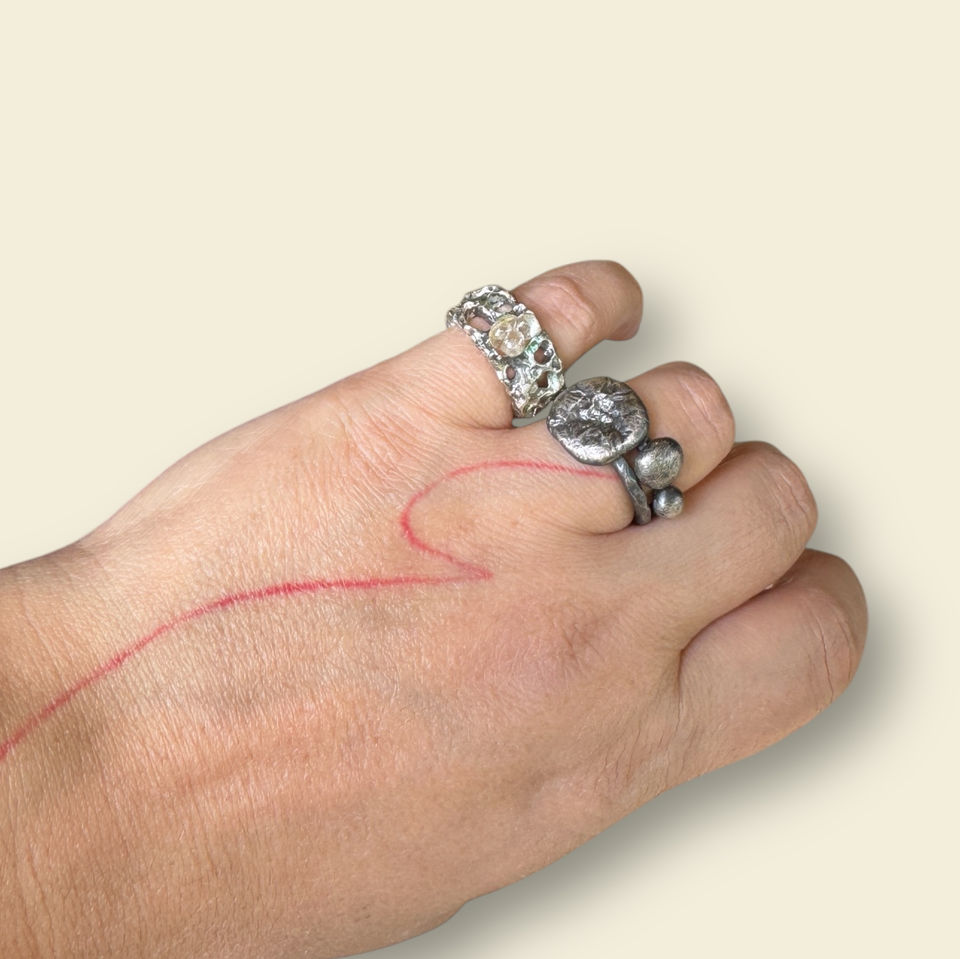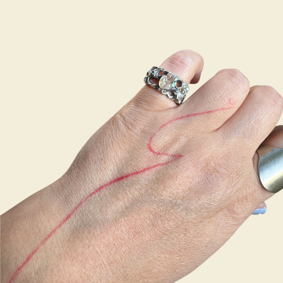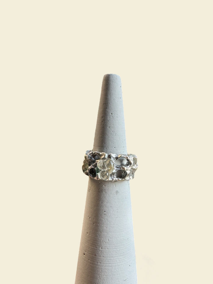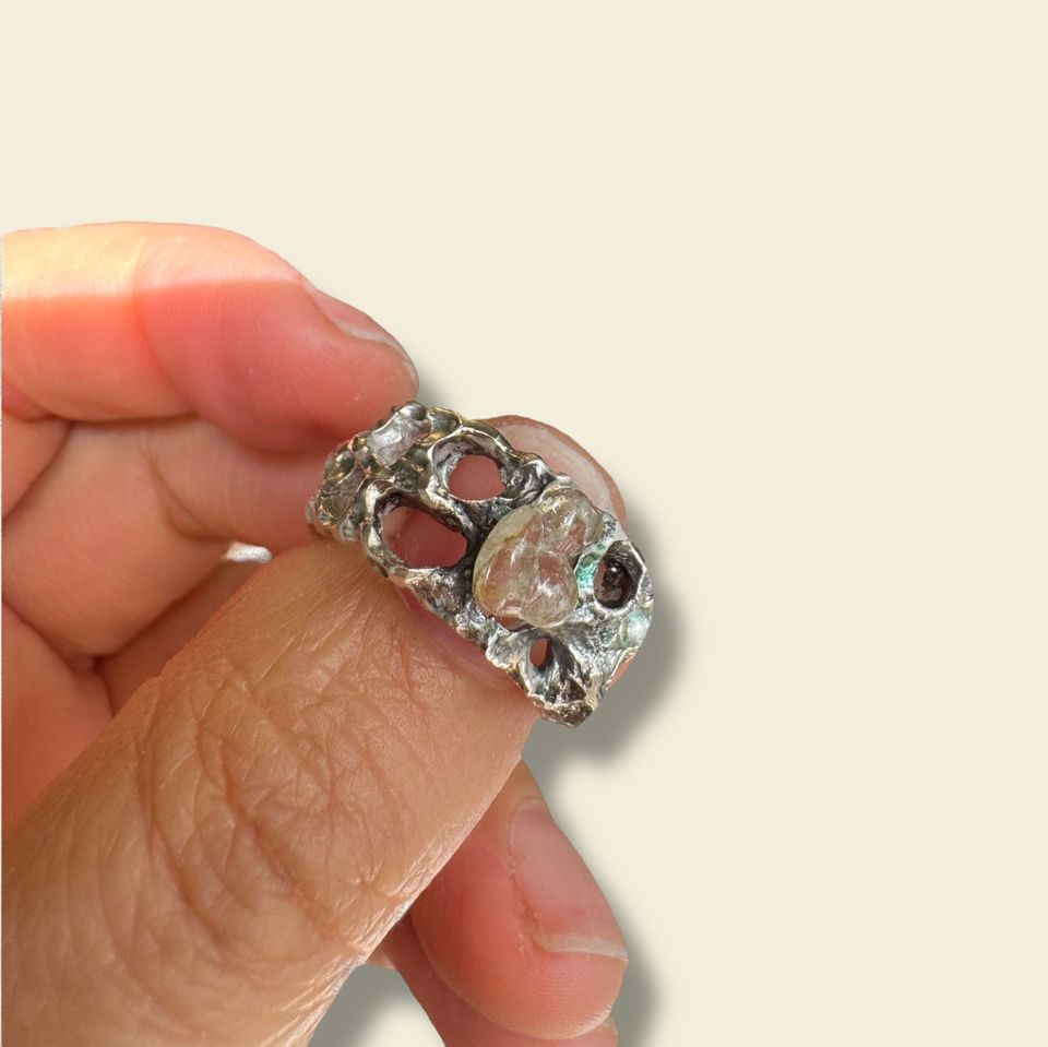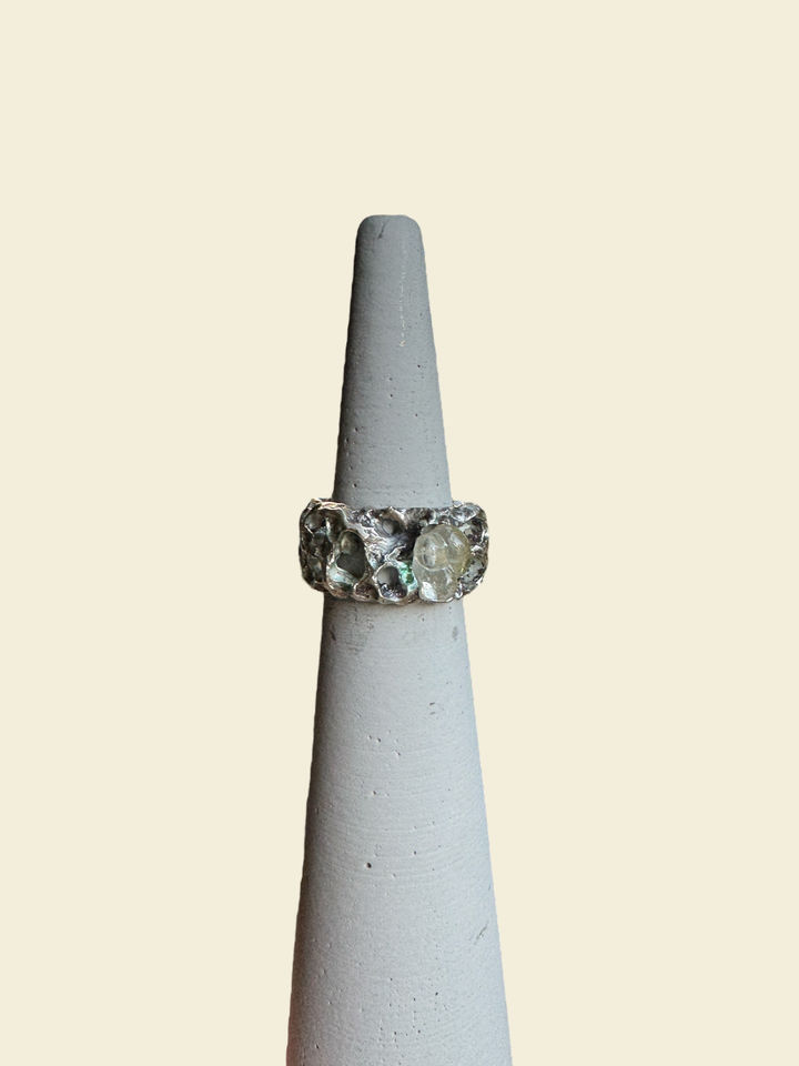 Yüzüğün yüzeyinde cam, sanki aniden donmuş bir akış gibi yer eder; içinde renk değil, derinlik taşır.